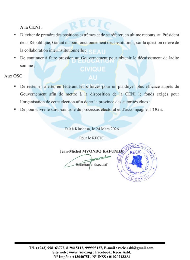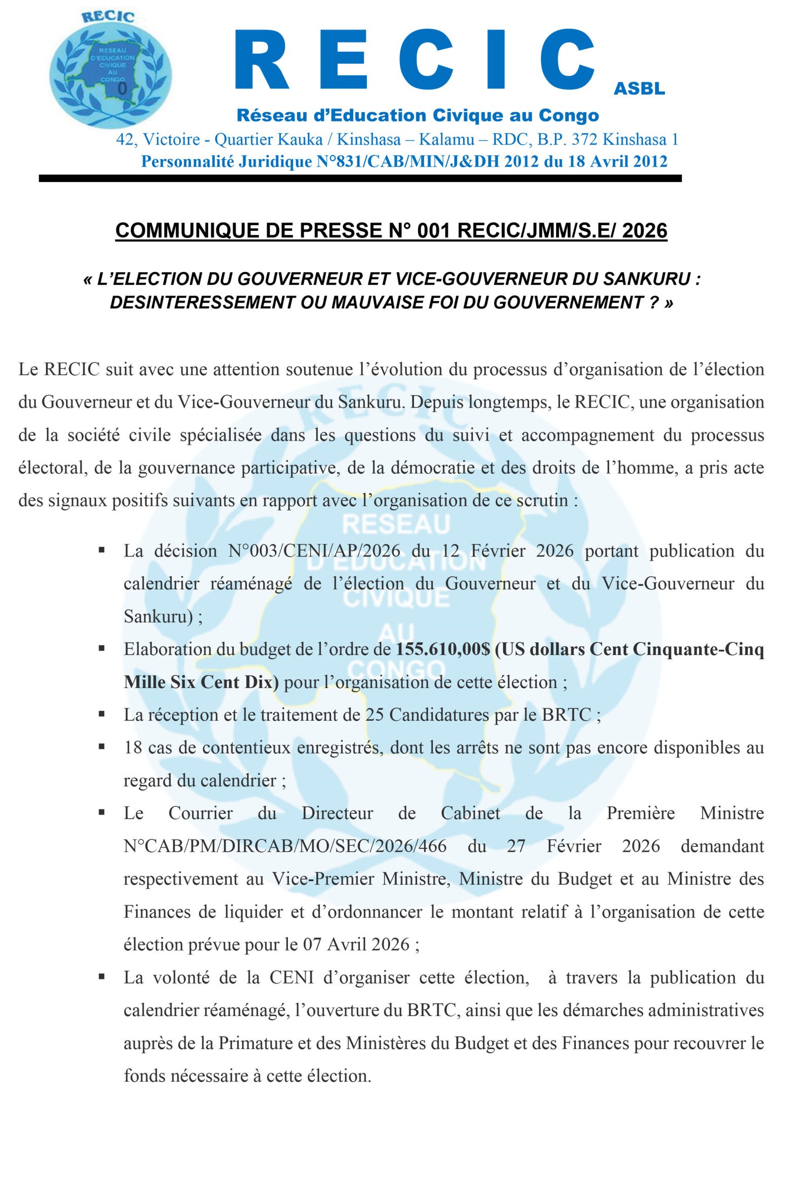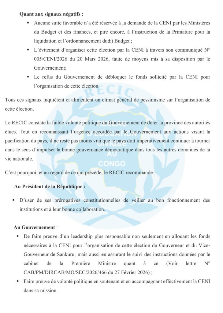 - De faire preuve d’un leadership plus responsable non seulement en allouant les fonds nécessaires à la CENI pour l’organisation de cette élection du Gouverneur et du Vice-Gouverneur de Sankuru, mais aussi en assurant le suivi des instructions données par le cabinet de la Première Ministre quant à ce (Voir lettre N° CAB/PM/DIRCAB/MO/SEC/2026/466 du 27 Février 2026) ;