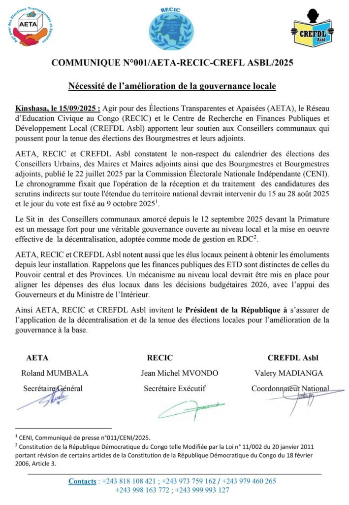 AETA, RECIC et CREFDL Asbl constatent le non-respect du calendrier des élections des