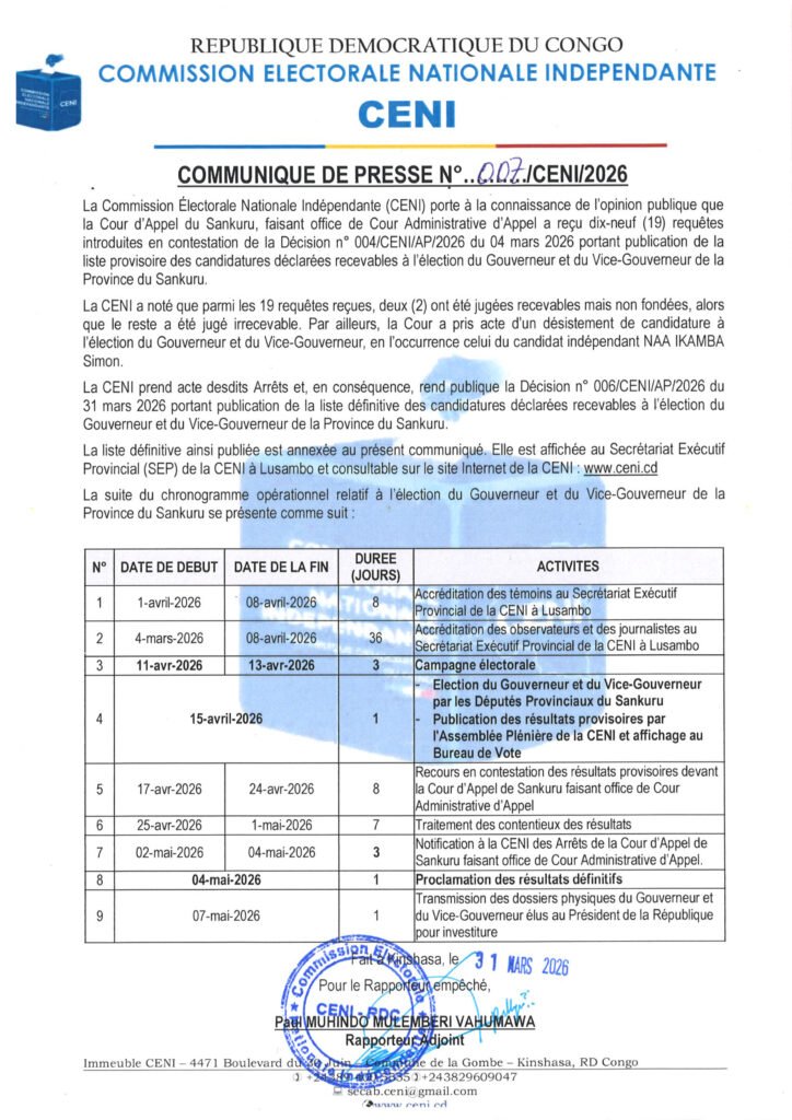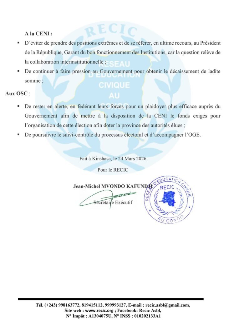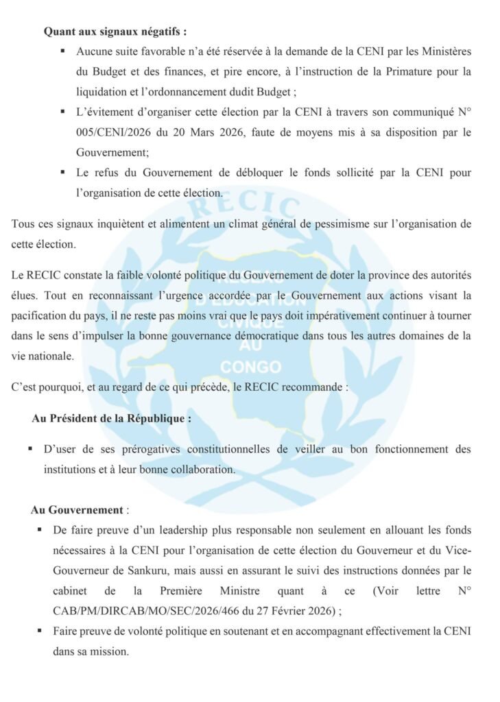 Après son communiqué N°001/RECIC/JMM/SE/2026 du 24 Mars 2026, le RECIC se réjouit la sonnette d’alarme qu’il a tiré ait attiré l’attention non seulement de la CENI, mais également du Gouvernement qui vient de mettre à la disposition de la CENI la somme de 155.610 $ pour l’organisation de cette élection. En effet la CENI vient de publier une mise à jour du Chronogramme de cette élection fixant notamment l’élection au 15 Avril 2026, la proclamation des résultats au 04 Mai et la transmission du dossier pour investiture au Président de la République au 07 Mai 2026. Tout en se réjouissant, le RECIC espère que rien ne viendra plus faire entrave à cette élection.