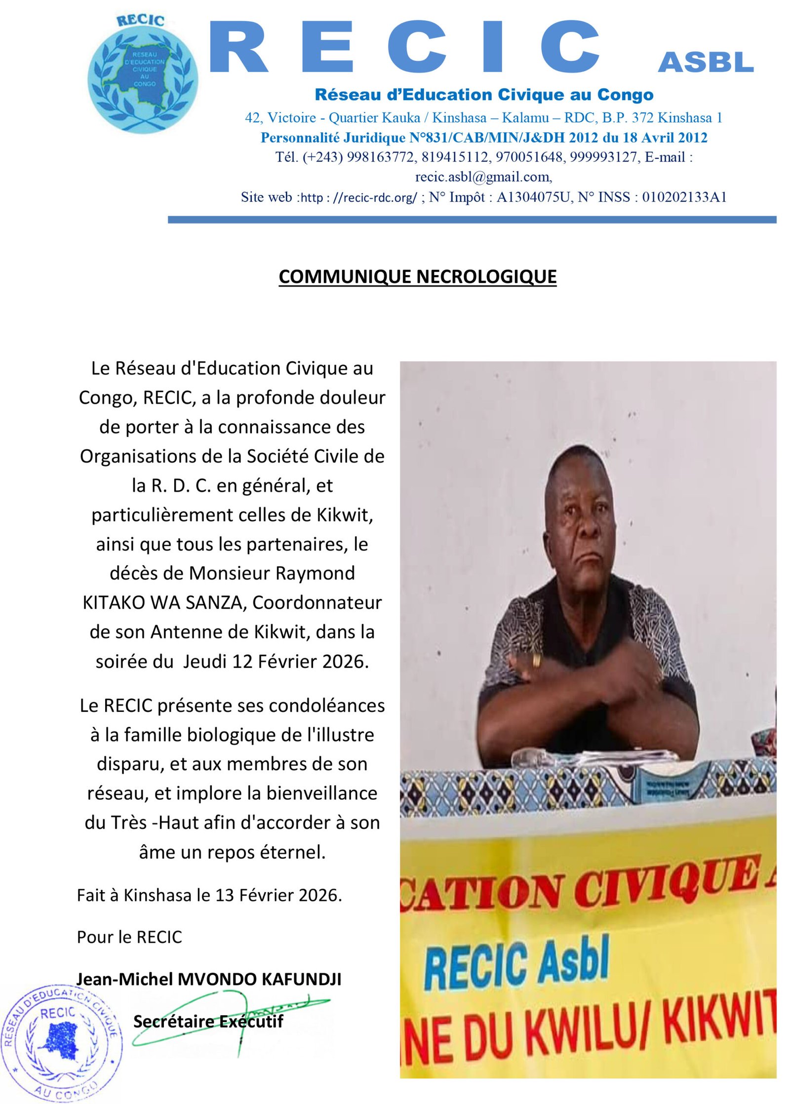 C’est avec une profonde tristesse et une immense douleur que nous annonçons le décès de Monsieur Raymond KITWAKO WA SANZA MOBINDA